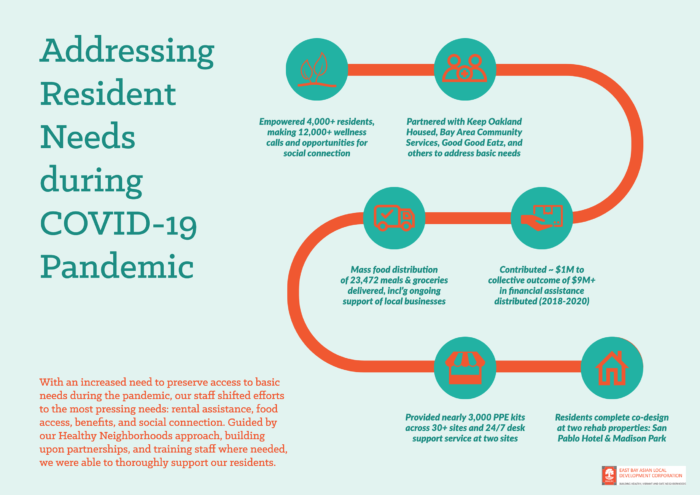 In the face of these crises, EBALDC demonstrated how community-based, culturally competent, and trusted partners are critical to provide essential services and support resilient communities. EBALDC’s model of “Healthy Neighborhoods” – organizing our work around four pillars of affordable rental housing, income and wealth building, resident and community engagement, and neighborhood partnership – meant EBALDC had the organizational infrastructure and community trust to respond to community need. And the needs were many – keeping people housed and helping them meet basic human needs for food, and access to health care, supporting our neighborhood, BIPOC businesses so they could stay open, and connecting our residents and community members to financial supports.