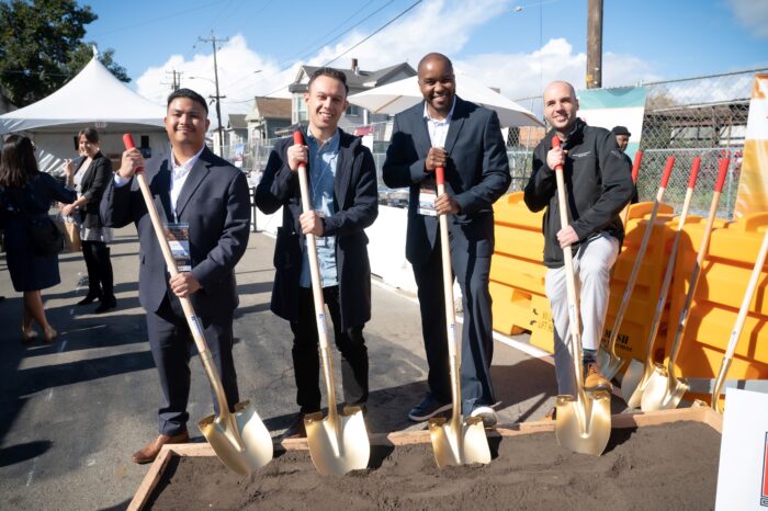 Groundbreaking at West Grand & Brush, November 2, 2023 l-r: Matt Almonte (EBALDC), James Perez (EBALDC), Gary Hill-Thomas (EBALDC), James Vossoughi (JPMorgan Chase)