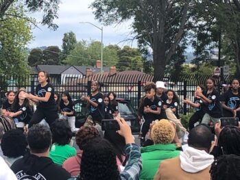“When I say ROOTING FOR, you say PEACE” boomed the MC, Rashidi Omari, on a cloudy May Saturday to a crowd gathered in the southeast corner of the Coliseum BART station parking lot. With the old red and white Sunshine Biscuits sign peeking through the trees, hundreds of folks, young and old, had come out to celebrate with the performers and the exhibitors at the “Moving for Peace, Blooming with Joy” Community Block Party. The event, co-sponsored by The Healthy Havenscourt Collaborative (HHC), Destiny Arts Center, and Better Neighborhoods, Same Neighbors (BNSN), included a Black Cultural Zone-sponsored roller rink, local food, nonprofit, and small business vendors, such as Mangosay, Sassy She’s Accessories, and Melanin Gang (a list of vendors can be found here). According to Aurora Chavez, Healthy Havenscourt Manager, the Block Party is a collaborative effort organized by HHC partners to build a healthier neighborhood and to “celebrate the accomplishments of our young people and community.”