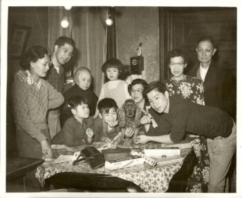 I was born to immigrant parents and lived the first few years of my life in New York City’s Lower East Side Chinatown, and I had the good fortune to marry into Tiffany’s family, which has been living and working in Oakland Chinatown since the early 20th century. They came to Oakland after being displaced by the 1906 earthquake and subsequent Great Fire in San Francisco, likely staying for a few weeks in a largely segregated Chinese American tent city along the estuary channel leading to Lake Merritt. They settled in the neighborhood east of core commercial Chinatown, lived through the flu pandemic of 1918 and the Great Depression, sent two generations of kids to Lincoln Elementary School, started a local optometry practice, and produced the first elected Asian American public official in Oakland. At one point after the war, four generations of their family lived close together in Oakland Chinatown. This family picture was taken in 1950, in the house where my father-in-law grew up, located at 8th Street and Fallon.