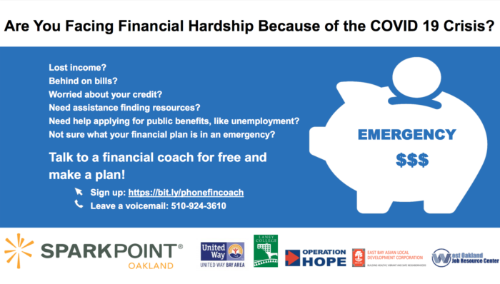 SparkPoint Oakland is providing free financial coaching and resource support during the COVID-19 crisis via remote, 1:1 phone/video conferencing appointments.
